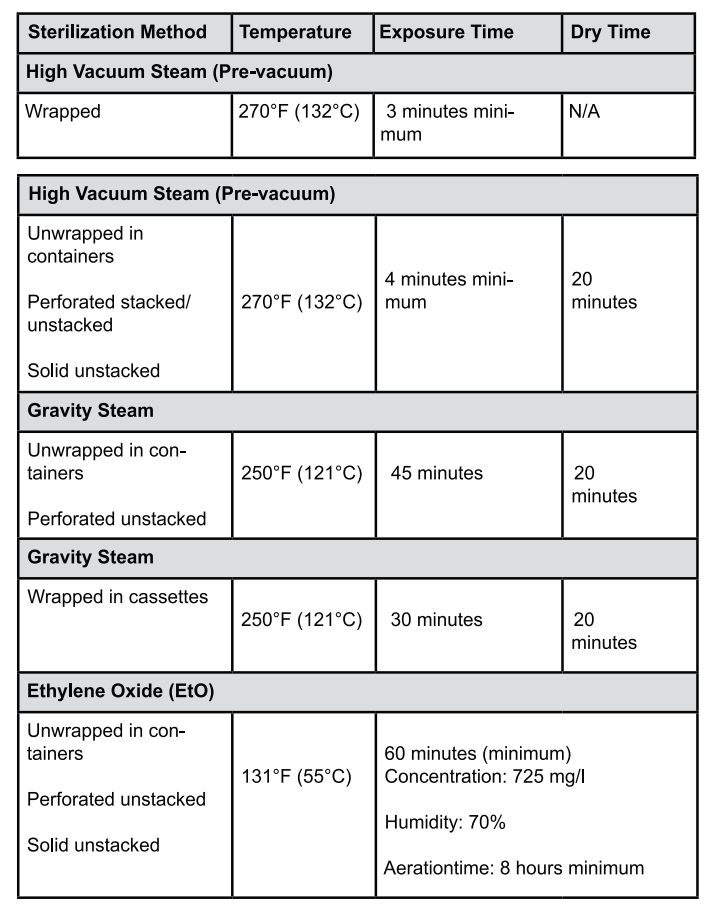 - Do not use dry heat sterilization for aluminum or plastic made, black coated or ebonized instruments.